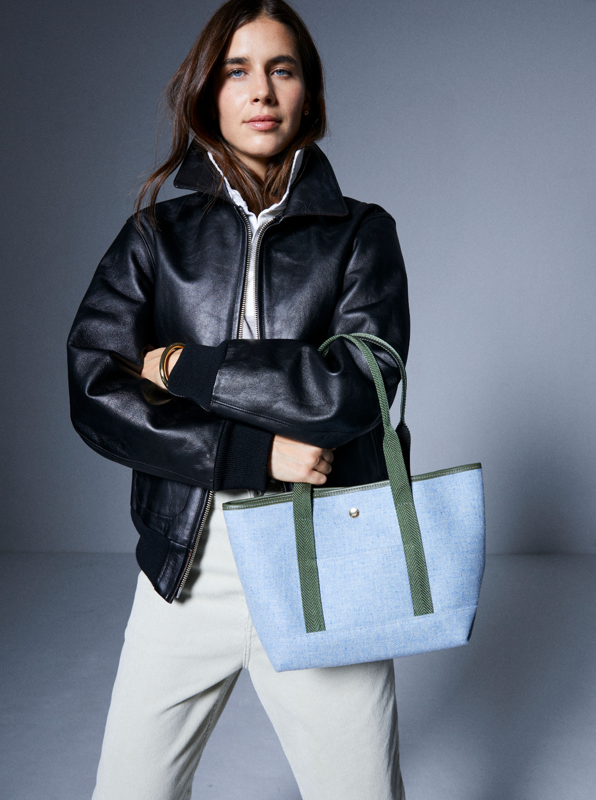 Crafted from premium sky blue twill, accented with green thin handles, adding a touch of sophisticated contrast. Features an exterior front pocket.